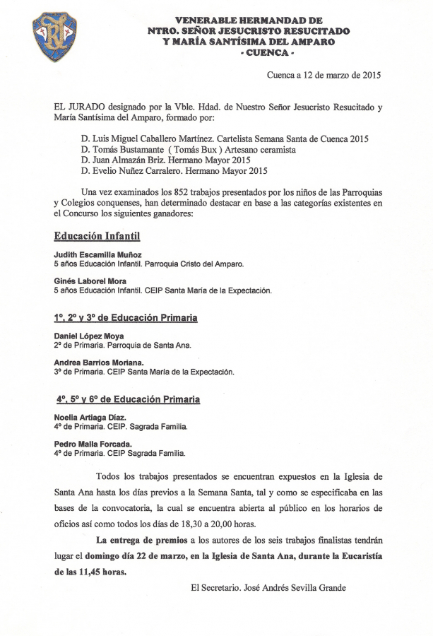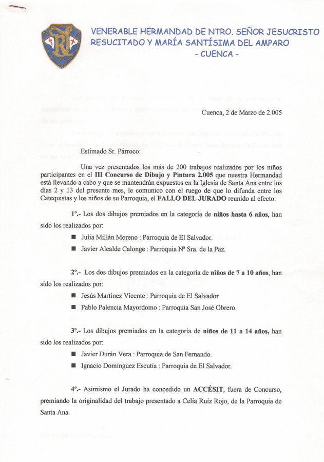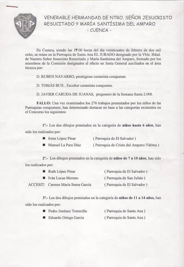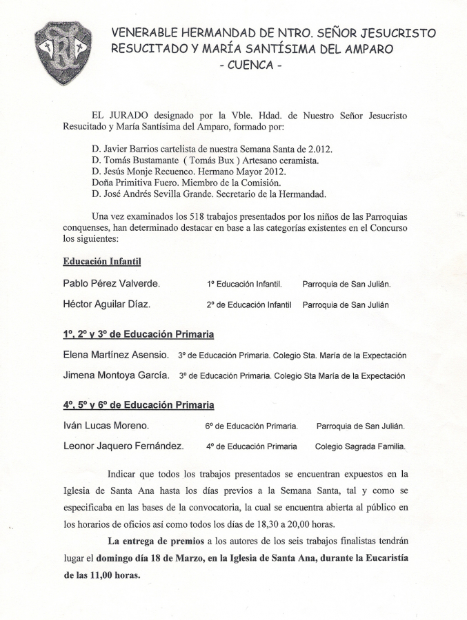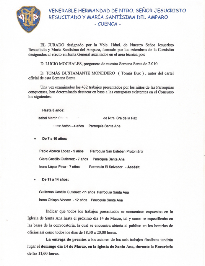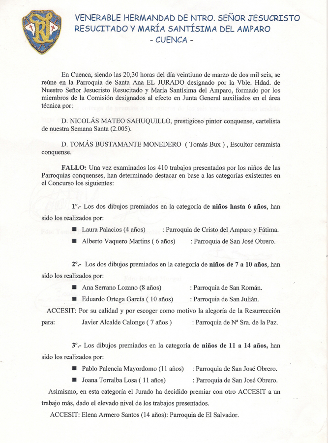 Sin duda alguna, el Concurso de Dibujo y Pintura de la Hermandad del Resucitado, como vulgarmente se conoce, se ha consolidado entre los niños que asisten a nuestras Parroquias, lo que ha cumplido con creces las expectativas que aquellos Hermanos allá por el año 2.002 se propusieron con la primera edición.