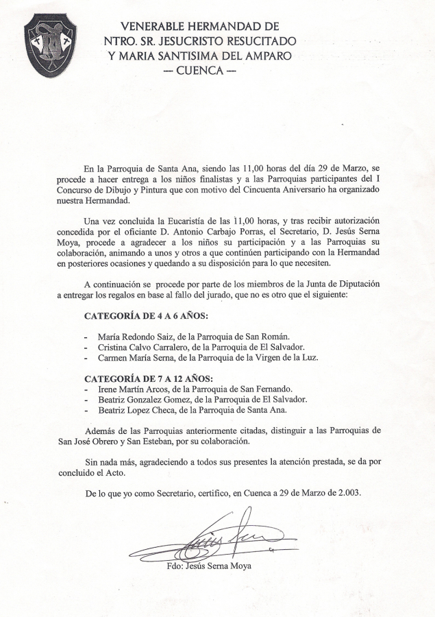 Fue en la sesión celebrada por la Junta General de la Venerable Hermandad el día 6 de Abril de 2.002, cuando, a propuesta de la Junta de Diputación y motivada por la búsqueda de nuevos actos para la celebración del Cincuenta Aniversario en el año 2.003, se aprobó celebrar un Concurso de Dibujo y Pintura entre escolares de Cuenca.