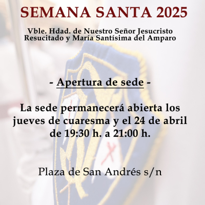 Como cada año, una vez llegada la cuaresma, nuestra sede abrirá un día a la semana para que nuestros hermanos puedan realizar cuantas gestiones necesiten: compra de enseres, bonetes, escudos, domiciliación de cuotas, pago de las mismas...