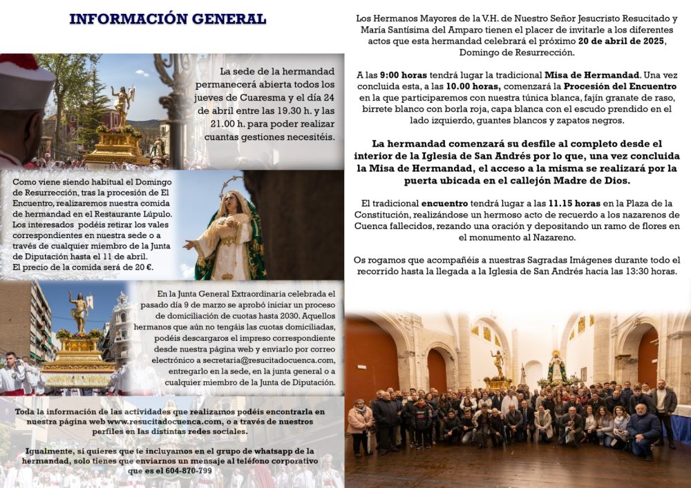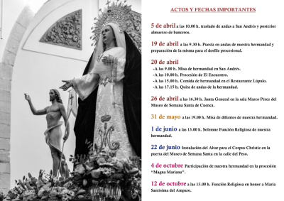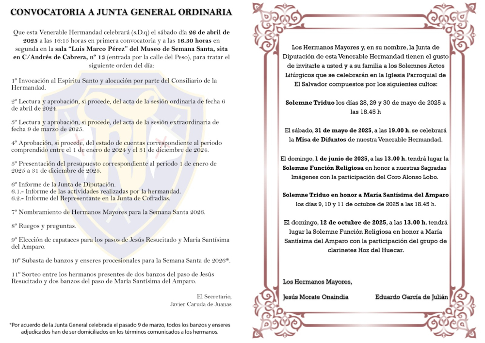 Tal y como viene siendo habitual, nuestra hermandad celebrará su Junta General Ordinaria "de Subasta" el primer sábado de Pascual. Será el próximo día 26 de abril, a las 16.30 h. en la sala Marco Pérez de lMuseo de la Semana Santa.