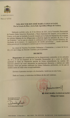 Con fecha 25 de febrero, hemos recibido el decreto episcopal por el que se dispensa del cumplimiento de dichos artículos. Queda, por tanto, suspendida la celebración de nuestra tradicional junta general hasta que la situación sanitaria permita su celebración.