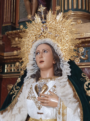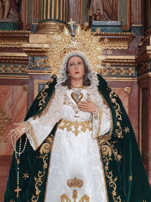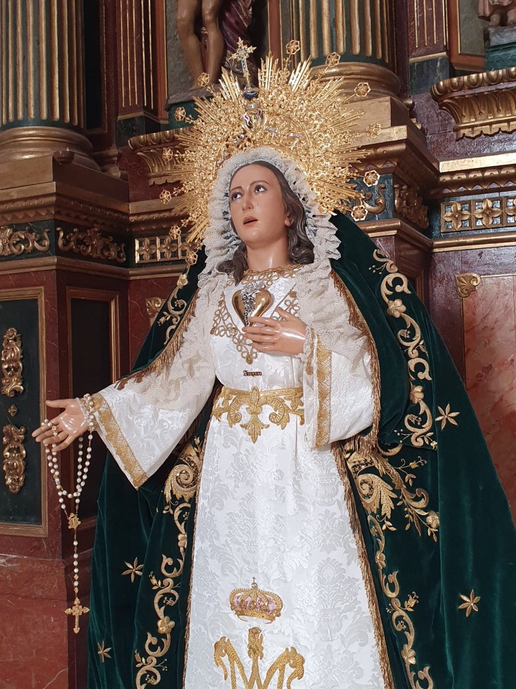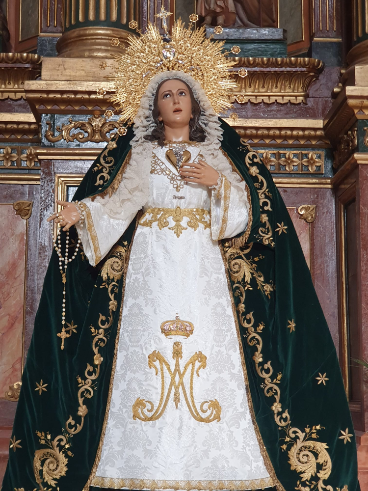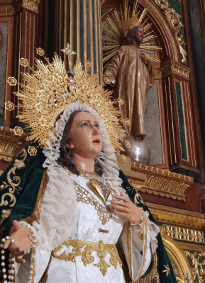 Ubicada en su altar de cultos, María Santísima del Amparo lucía su saya procesional, diadema procesional y manto verde bordado por Encarnación Román.
