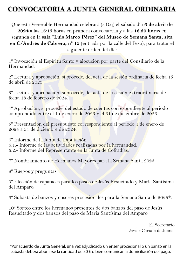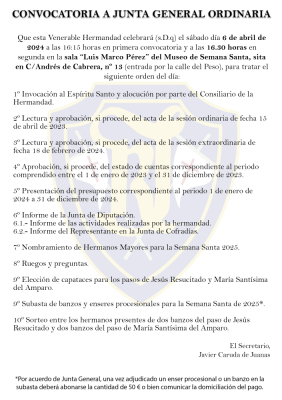 Como ya es habitual, nuestra hermandad celebra su Junta General Ordinaria el próximo sábado, 6 de abril, a las 16.30 h en la sala Marco Pérez del Museo de la Semana Santa de Cuenca.