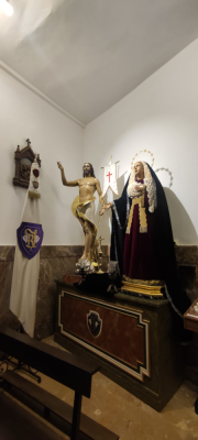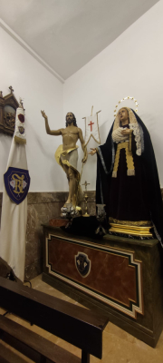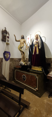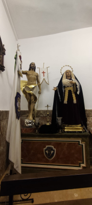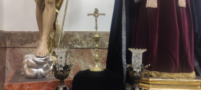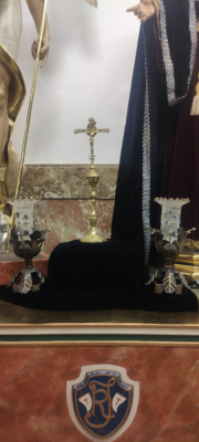 Por otro lado, se completa el altar con un crucifijo propiedad de la hermandad sobre terciopelo negro completado con dos lámparas funerarias de principios del siglo XX que bien pudieran haberse usado para los velatorios en los domicilios de los fallecidos.
