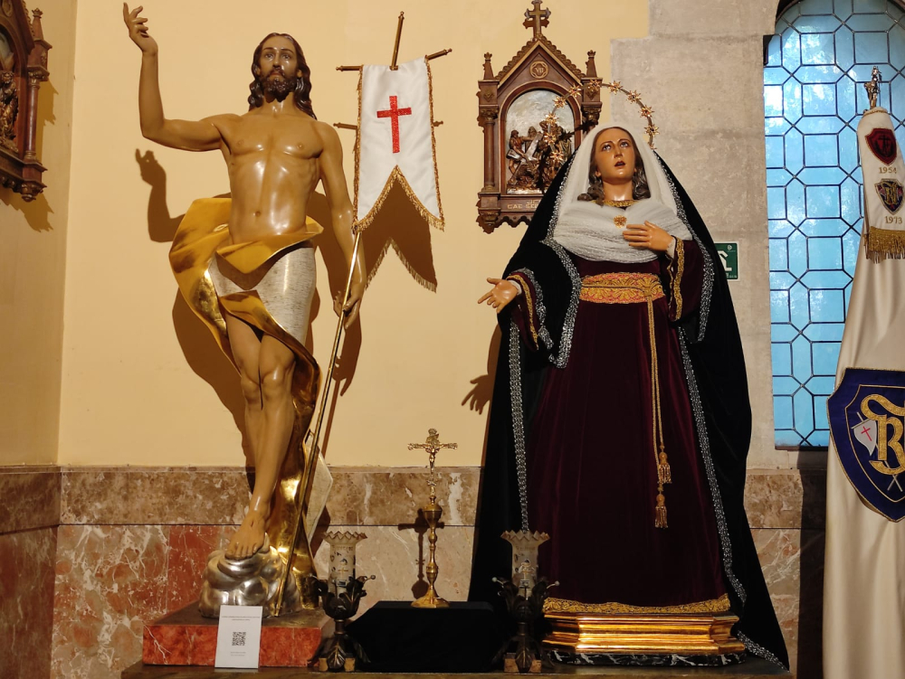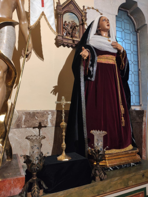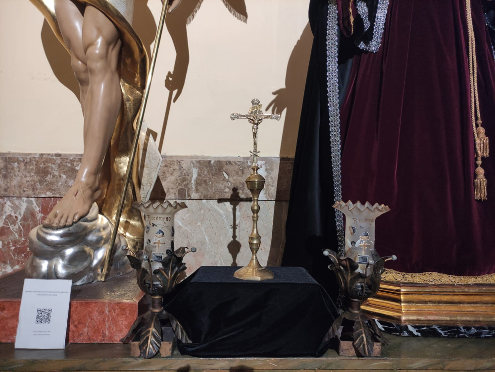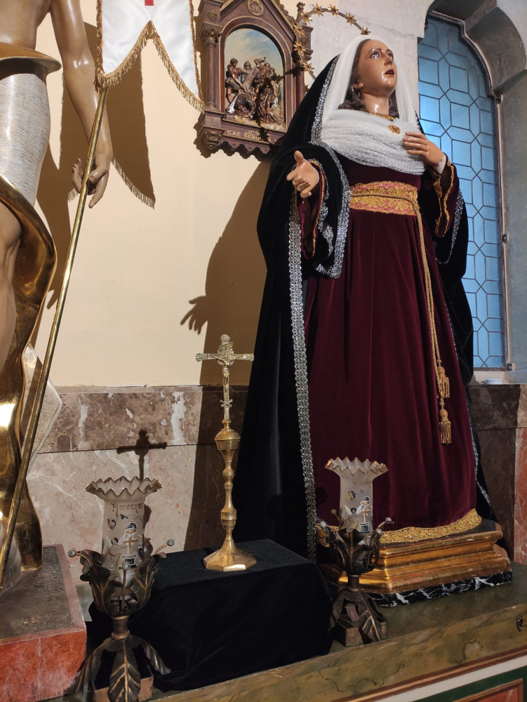 Se complementa el altar con un paño negro sobre el que se dispone un crucifijo propiedad de la hermandad así como dos tulipas de difuntos cedidas para esta ocasión por una devota.