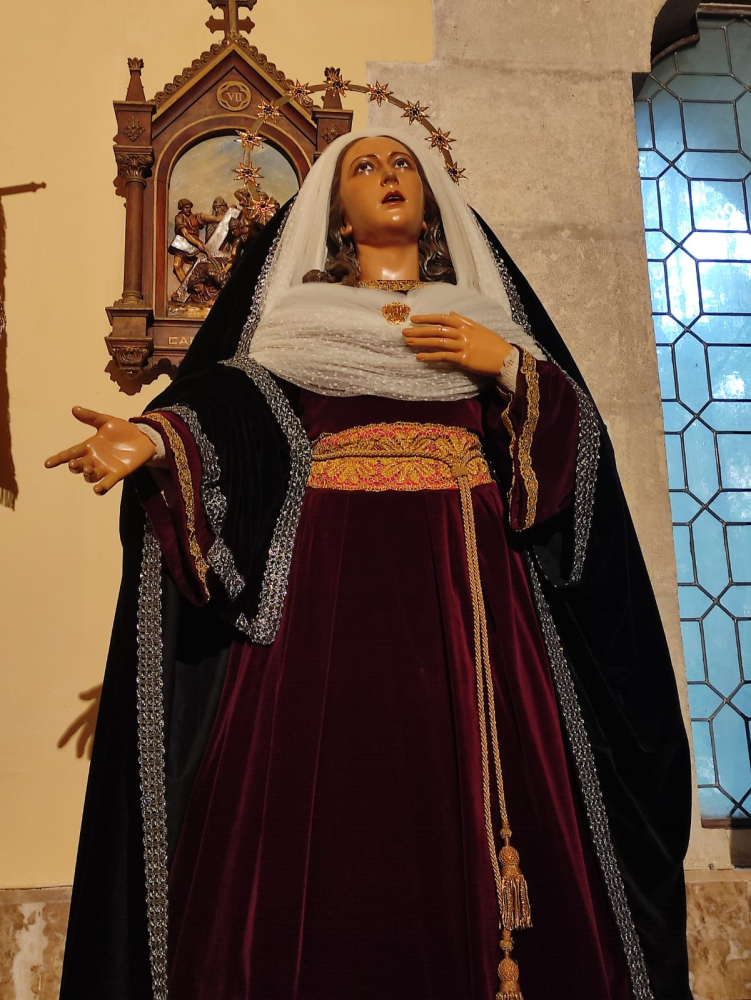 Dedicamos el mes de noviembre al recuerdo de todos aquellos familiares, amigos, conocidos que nos dejaron camino de la casa del Padre Celestial. Como cada año, María Santísima del Amparo se viste de luto durante este mes propicio para la reflexión y el recuerdo. En esta ocasión viste su tradicional saya granate y el manto negro que se usara en los primeros momentos de la hermandad durante el desfile procesional. Luce nuestra madre un broche con el escudo corporativo.