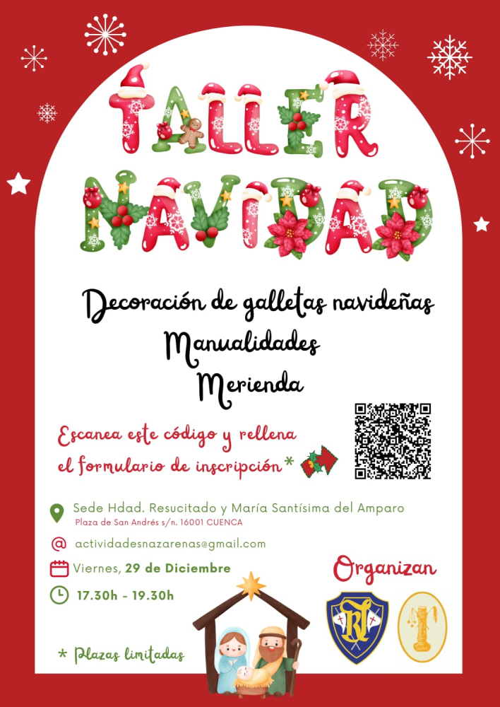El día 29 de diciembre, entre las 17.30 h y las 19.30 h, conjuntamente con la I.V.H. de Nuestro Padre Jesús amarrado a la columna, realizaremos un taller de decoración de galletas navideñas, manualidades navideñas, juegos...La tarde concluirá con una merienda de confraternización. Todos los interesados pueden inscribirse a través del email actividadesnazarenas@gmail.com o cumplimentando el siguiente enlace